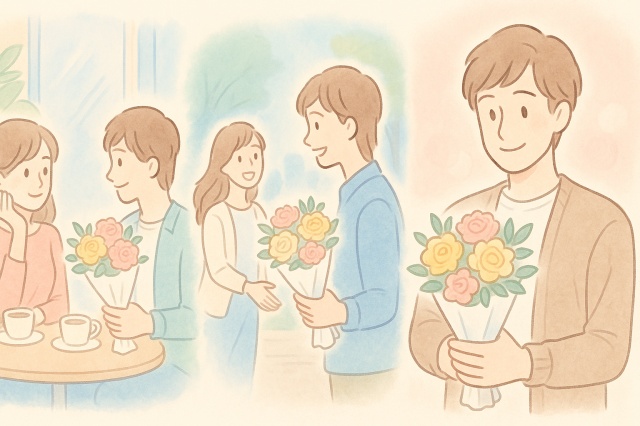 待ち合わせ場所で会ってすぐ花束を渡すと、緊張した空気が一気にやわらぎます。