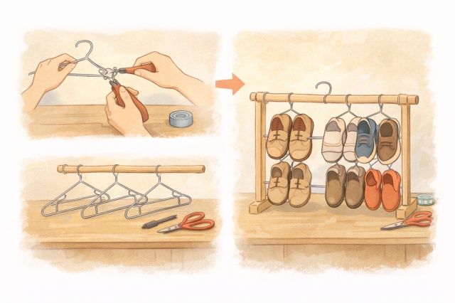 そんな悩みをスマートに解決してくれるのが、「ハンガーを使った靴収納スタンド」です。