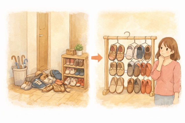狭い玄関の悩みを解決!ハンガーで作る靴収納とは?